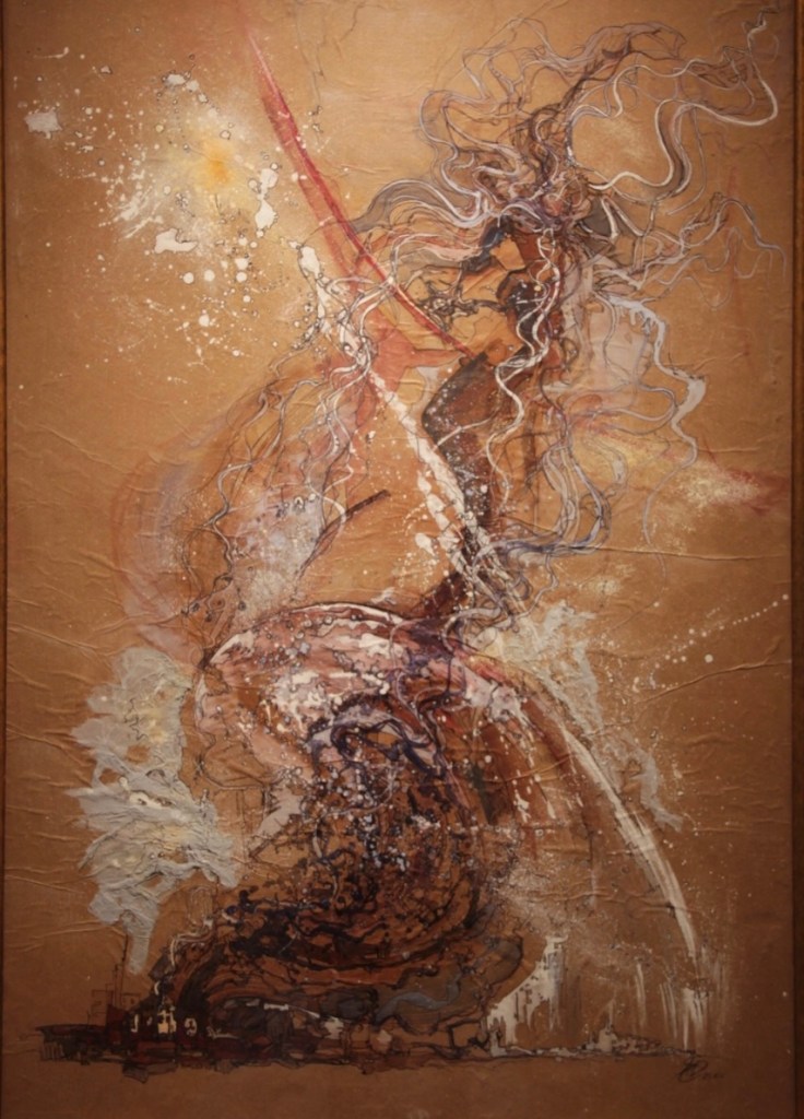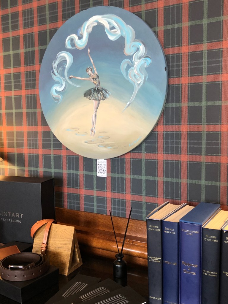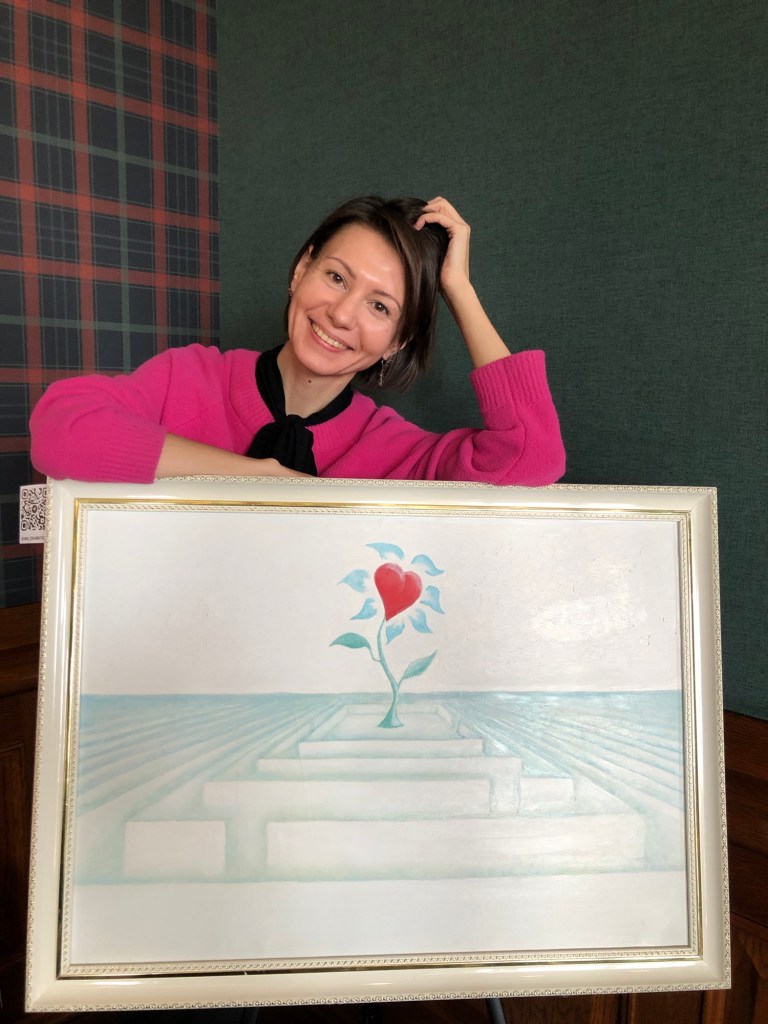 Уже знакомая в Завидово живописными ювелирными работами Юлия Кочеткова, член Творческого союза художников и участница многих российских и зарубежных выставок, в этот раз также представила две свои картины. Любовь к рисованию у Юлии была с детства. Будучи потомственным ювелиром, как художник Юлия стала себя реализовывать в 2004 году, когда начались ее поиски смысла жизни и ответов на вопросы: кто я и для чего живу. «Экспериментируя в творчестве, мне начали приходить образы, картинки, которые мне хотелось перенести на холст с помощью пальцев рук, не прибегая к кисти, сначала это были яркие мазки, а позже появились геометрия и объём. То, что выходило на холст, необыкновенно завораживало меня. Это были яркие динамичные картины, а в них — целый космос.