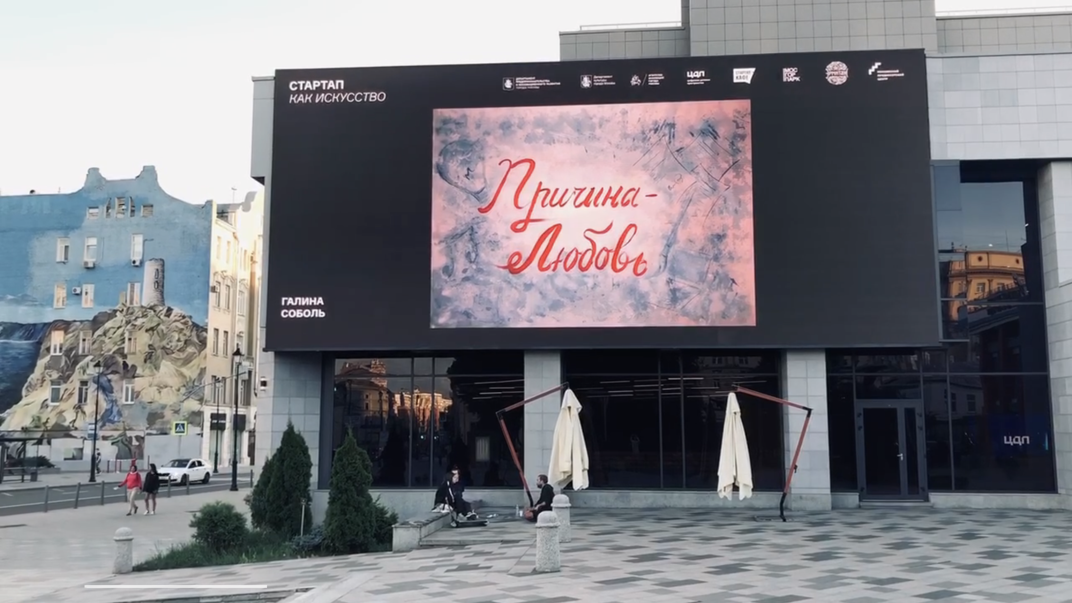 «В июне 2020 г. мне, как художнику, предложили поделиться идеей того, что объединяет стартап и искусство. Ответом на этот вопрос стала моя художественная работа «Причина — Любовь». Какого же было мое счастье, когда я узнала, что я вошла в число финалистов конкурса «Стартап как искусство» и с 24 июля по 24 августа 2020 года все прохожие и проезжающие на автомобилях люди могли наблюдать эту картину почти каждые 15 минут на большом плазменном экране на здании ЦДП вдоль Садового (Москва, ул. Покровка, 47). Благодарю организаторов конкурса ЦДП и Московский продюсерский центр за доверие, выбор моей работы и такую возможность», — Галина Соболь.